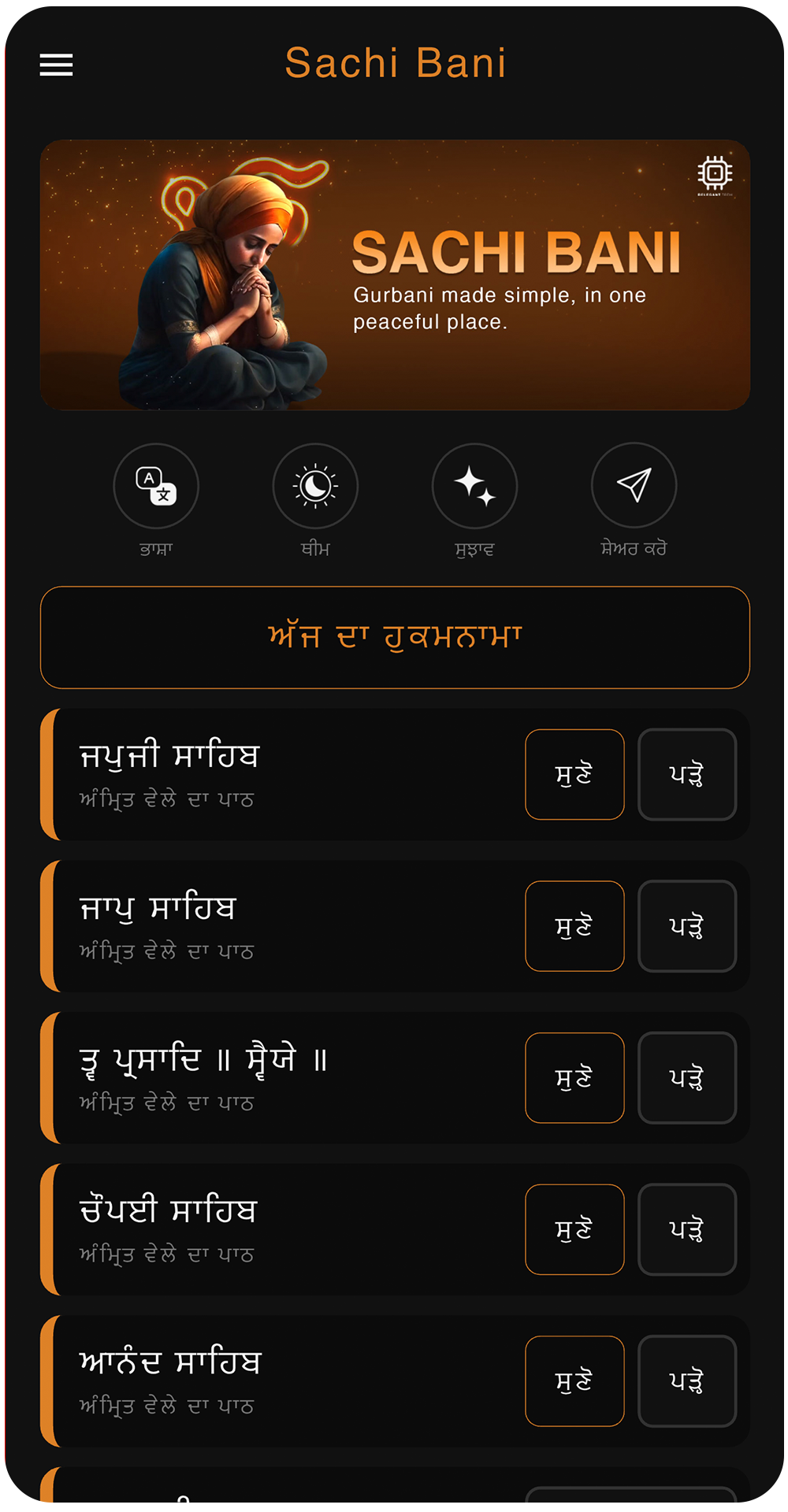 Download Sachi Bani – All Paths, a complete digital Gurbani and Gutka app for daily paath. Read and listen with precise audio sync, smooth auto-scroll, and a calm, distraction-free experience in Punjabi, Hindi, and English. Offline-friendly and designed for peaceful connection with the Bani.
