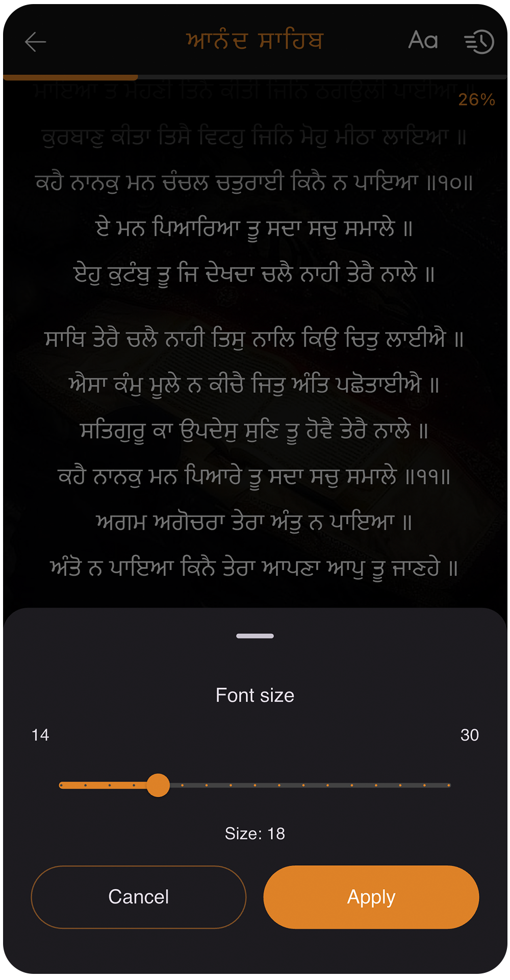 Increase or decrease text size to suit your reading comfort. Perfect for elders, long paath sessions, and strain-free reading. Enjoy clear and comfortable Gurbani text at your preferred size.