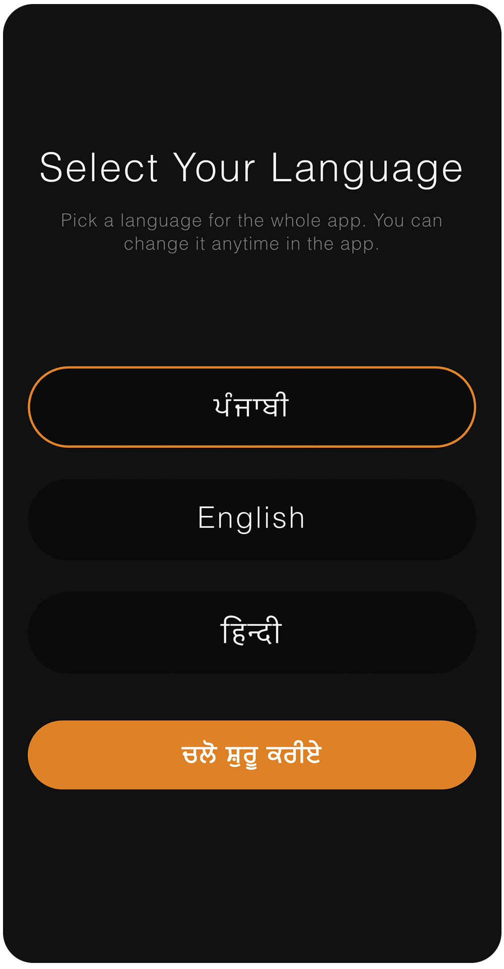 Pick a language for the entire app. All content will be shown in your selected language.You can change it anytime from the app settings.