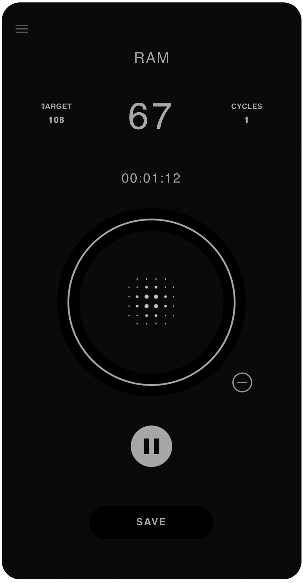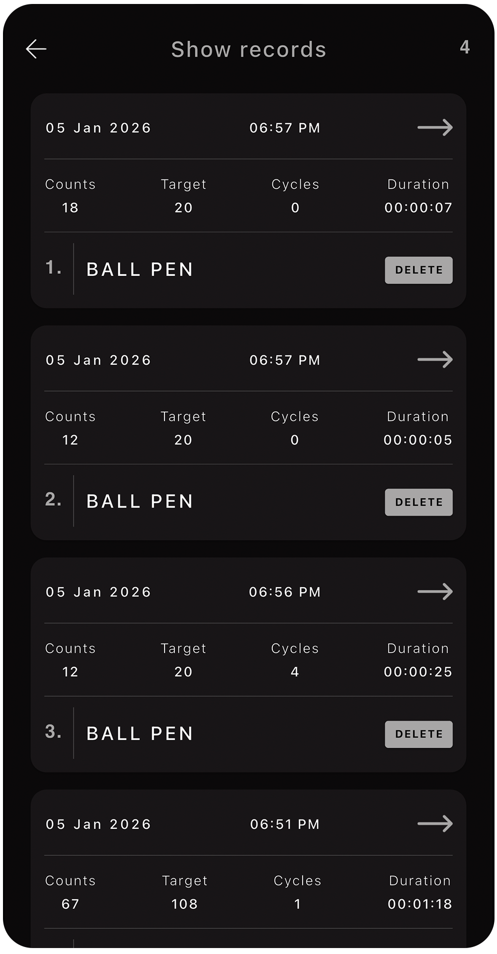 Access all your past sessions with clear details such as counts, targets, cycles, duration, date, and time in one organized list.