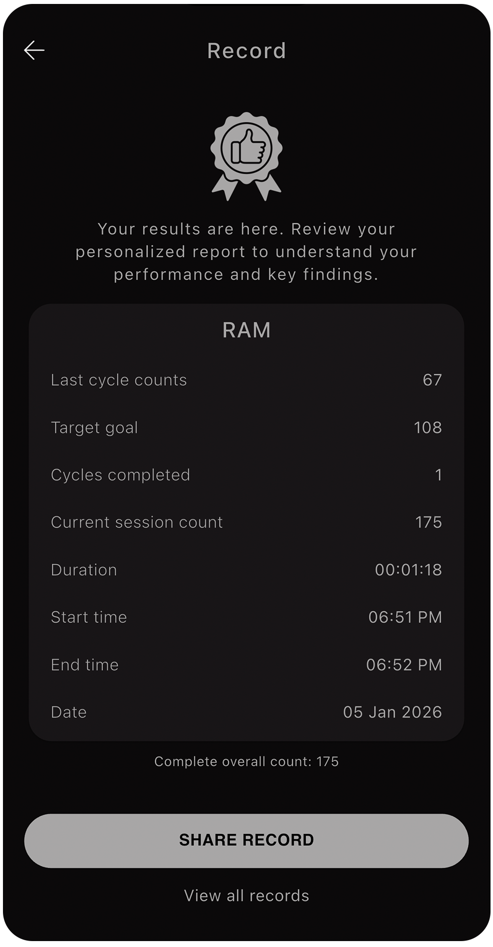 View a complete breakdown of your session including last cycle count, target goal, cycles completed, total count, start time, end time, and duration.